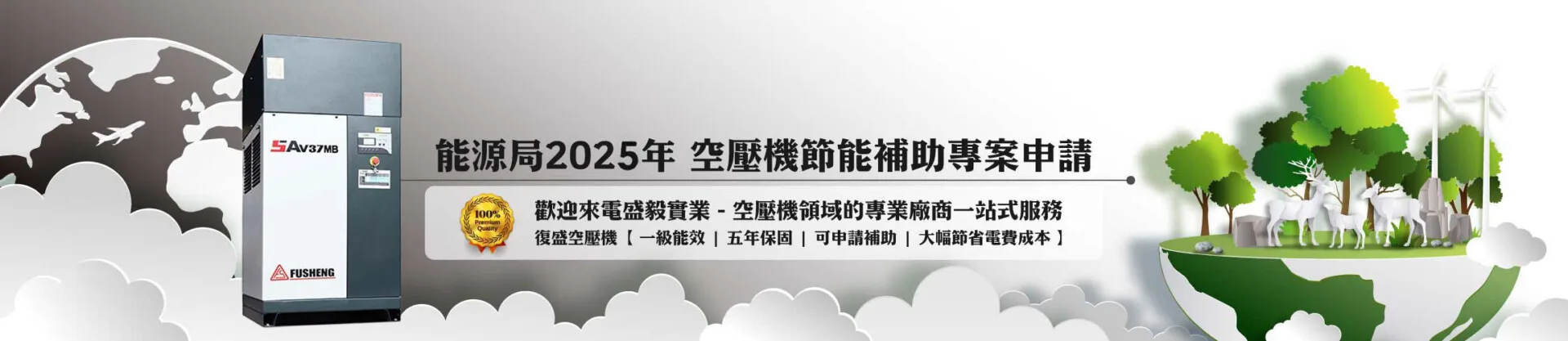 114年度空壓機補助申請注意事項,購買復盛能效系列空壓機可申請能源局相關補助,申請時間有限,請聯繫【盛毅實業】我們將協助您購買合適產品及線上申請補助,歡迎填寫線上表單或來電洽詢,誠信服務給您最好產品與規劃!